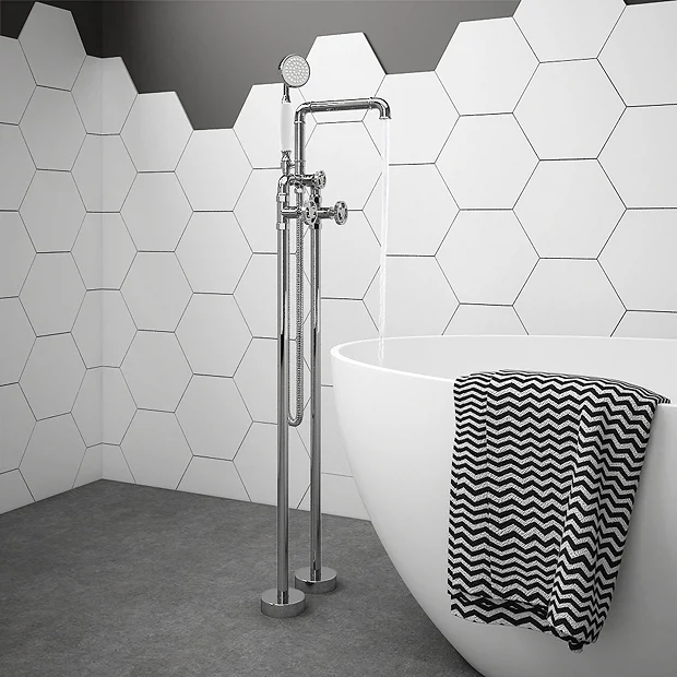 The stylish Arezzo industrial-style polished chrome freestanding bath shower mixer tap is perfect for adding a striking finishing touch to your contemporary bathroom. Crafted to the highest standards, this stunning floor mounted tap features a stripped-down aesthetic with a round knurled textured tap heads, perfect for creating an eye catching industrial look in your bathroom. Plated in chrome which is highly resistant to corrosion. Tap comes complete with a large single function shower handset, handset holder and shower hose.Â