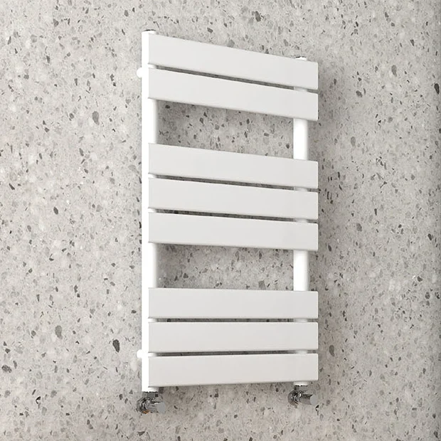 Bring a designer look to your bathroom with the modern matt white Arezzo 840 x 500mm wide heated towel rail, featuring stylish horizontal flat tubes with a straight profile. Manufactured from durable steel with a quality matt white finish, this stylish towel rail provides superb heat output which will gently warm towels and your bathroom or cloakroom.