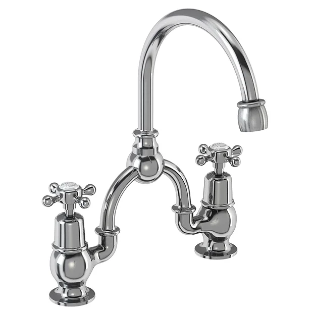 The Burlington Birkenhead 2 Tap Hole Bridge Curved Spout Basin Mixer (200mm centers) with Plug & Chain, create the perfect period bathroom with our range of quality chrome plated traditional taps. Comes with a 15 year guarantee. All Birkenhead taps have a six spindle tap head with a ceramic indice in the centre.