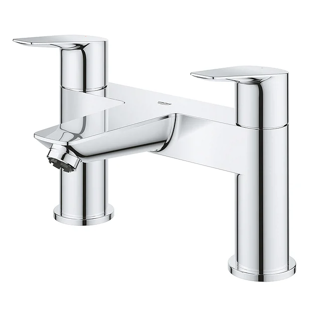 The Grohe Start Edge Bath Filler features clear cut lines in a contemporary design. It features solid metal handles and quarter turn ceramic valves. Suitable for use with medium water pressure, this deck mounted tap comes with the GROHE StarLight chrome finish that will be a visual highlight in your bathroom and easy to clean.Â