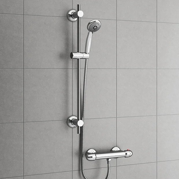 This Exposed Thermostatic Bar Shower Valve is part of our contemporary collection of bathroom products. Modern styling with chrome finish and constructed from solid brass. Thermostatic showers prevent a fluctuation in temperature whilst the shower is running – prevents the risk of scalding, or sudden cold spells. The valve is pre-set to a safe and optimal 38°C, this can be easily offset by holding down the safety push and click button on the handle.