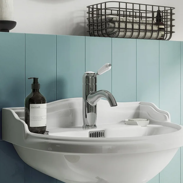The Lancaster traditional mono basin mixer with curved spout, part of our range of traditional bathroom taps with its elegant spout design and expertly crafted white ceramic lever handle, it’s classic design will bring a touch of sophistication to your bathroom. Manufactured from solid brass with a stunning chrome finish. Single lever handle controls temperature and flow of water.