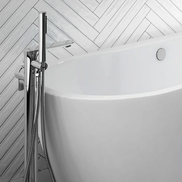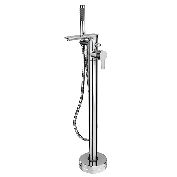 This 950mm tall Madrid Freestanding Bath Shower Mixer offers versatile bathing while adding a splash of sophistication to your space. Suitable for modern bathrooms, it boasts contemporary curves and smooth flat surfaces for a chic look. Use the fixed projecting tap to fill your tub with bubbles or select the cylindrical shower head handset for washing hair and rinsing down. This high quality freestanding bath tap is crafted from robust brass with a chrome plated finish for a gleaming clean appearance. A single lever handle allows easy control of temperature and flow.