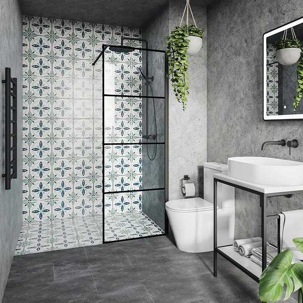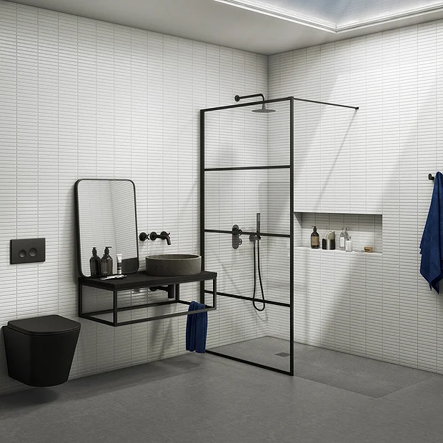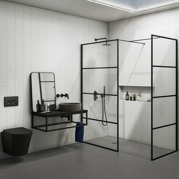 The rectangular Osaka walk-in wet room screen features urban inspired digitally printed statement black horizontal partition lines window-frame panelling for added dimension and depth in your bathroom. Available in a range of widths from 700mm to 1400mm, you can combine it with other screen sizes to create the shower enclosure of your choice. This trendy black frame shower screen is made with 8mm toughened safety glass and comes with a matt black stainless steel support bar for a contemporary touch.
